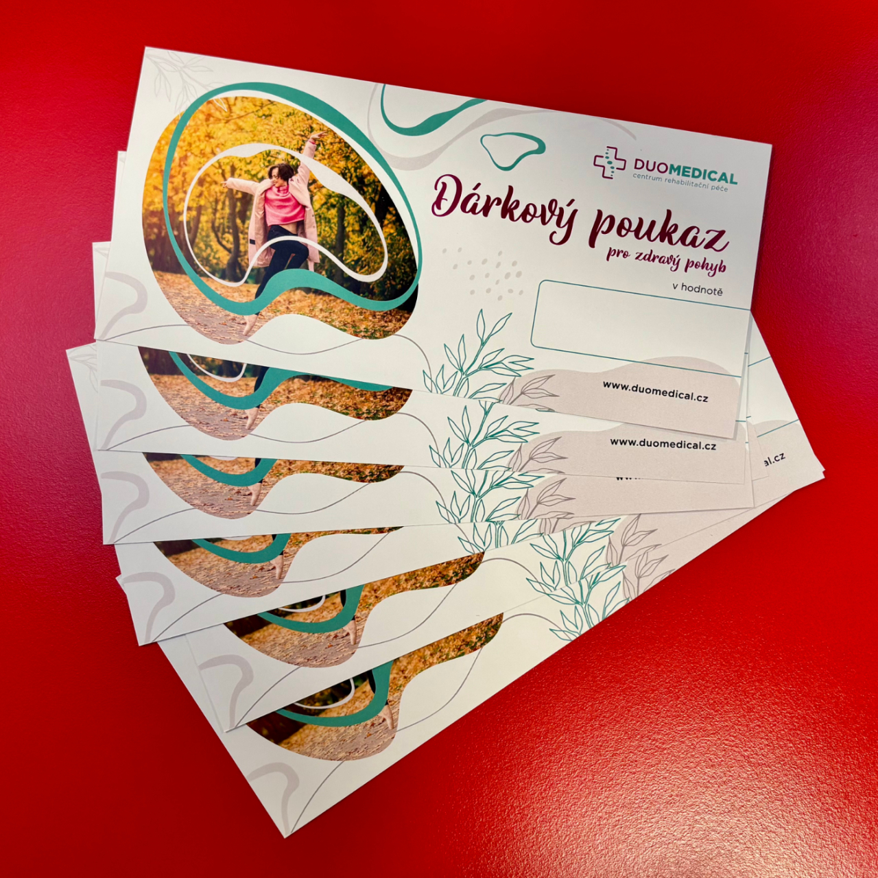 Kreativní grafický design a tisk dárkových poukazů na míru – profesionální zpracování reklamních materiálů pro zdravotnické a estetické služby.