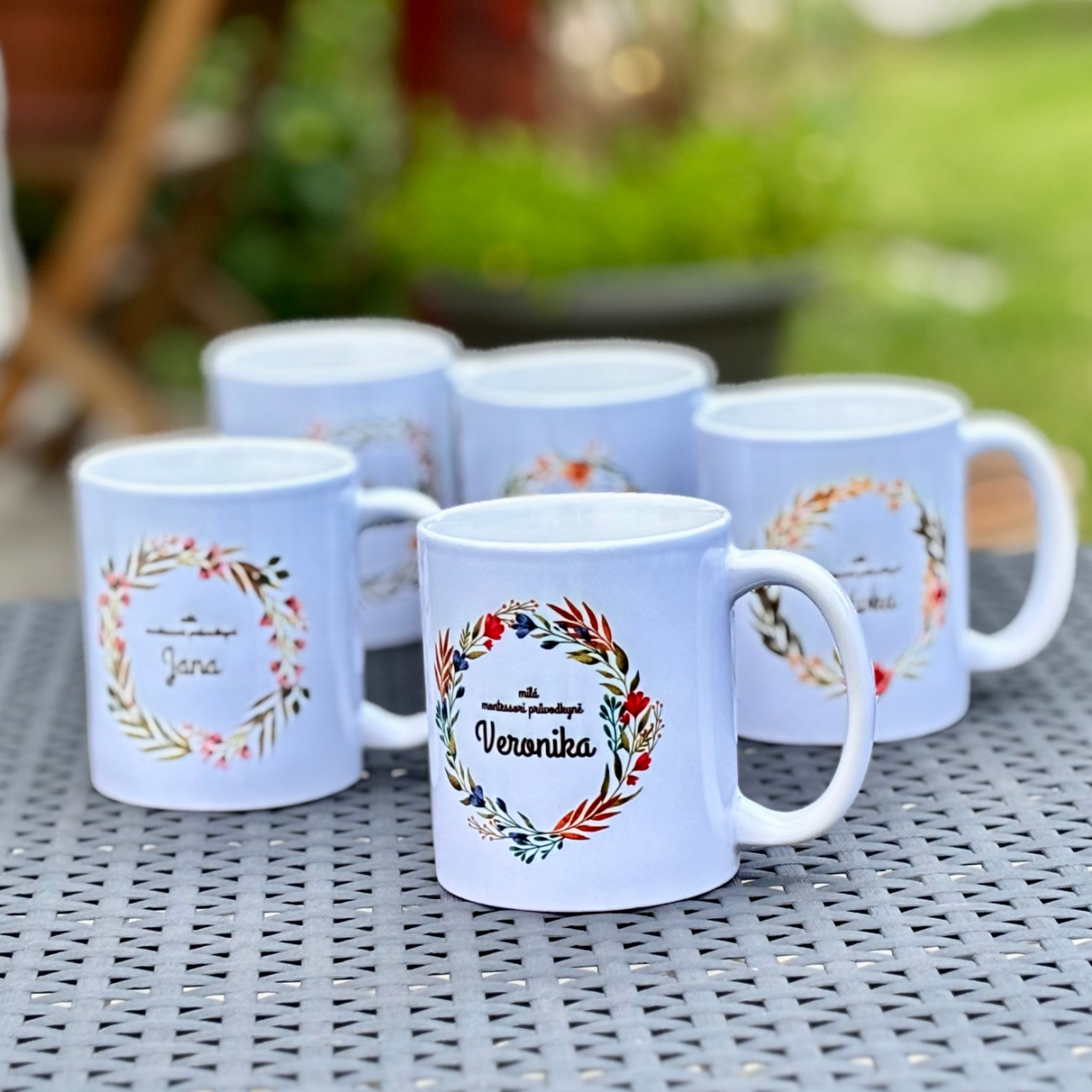 Hrnky se jménem a květinovým motivem vytvořené zakázkovým potiskem – originální potisk hrnků, plecháčků a termosek pro školní projekty a dárky.