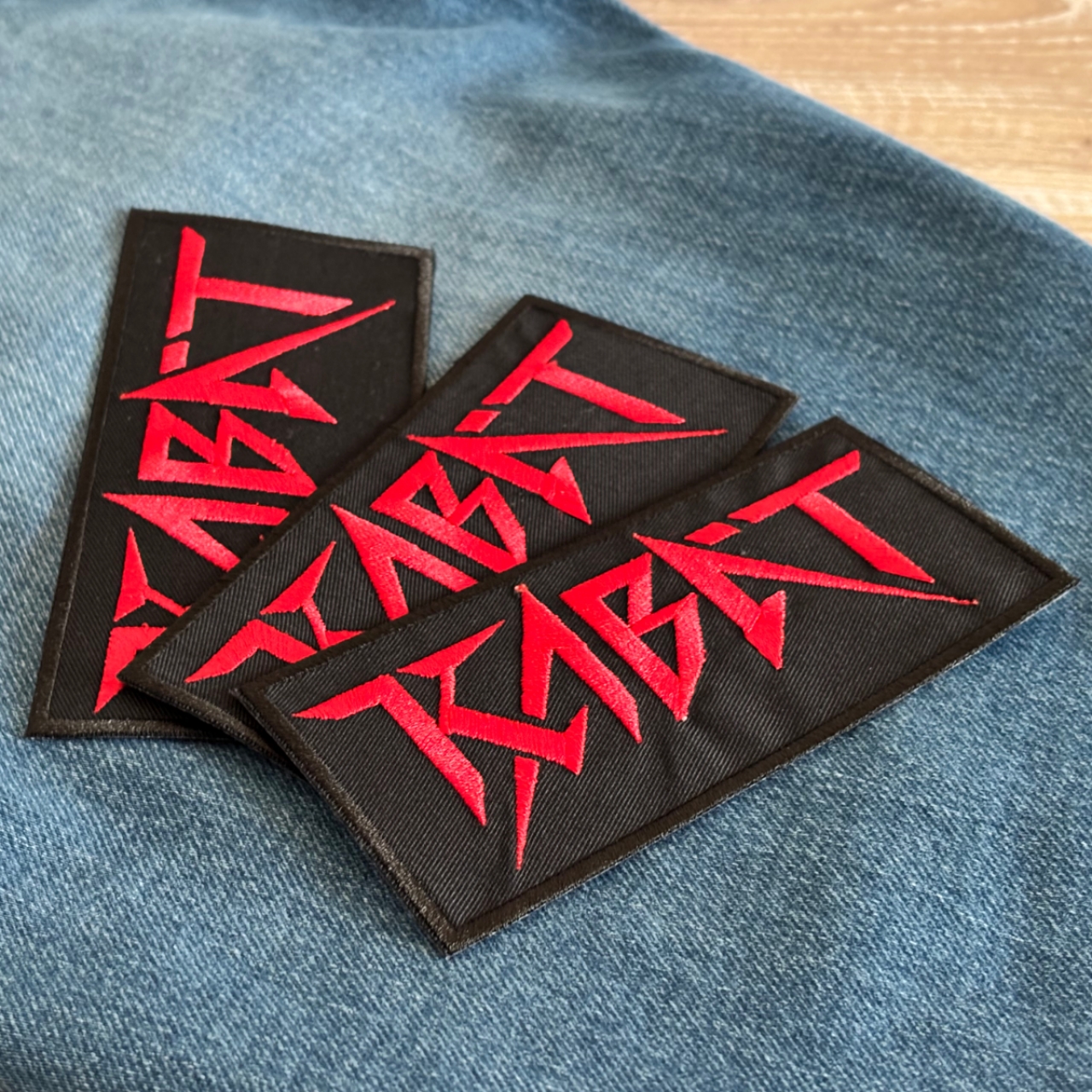 Nášivky s logem kapely Kabát vyrobené na zakázku – textilní merchandising a reklamní doplňky pro fanoušky a promo akce.