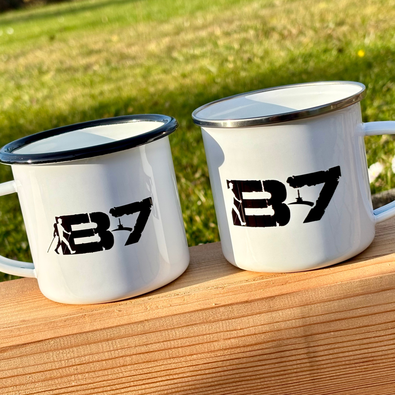 Plecháčky s logem závodu B7 vyrobené technologií zakázkového potisku – reklamní potisk hrnků, plecháčků a termosek pro sportovní akce a merchandising.